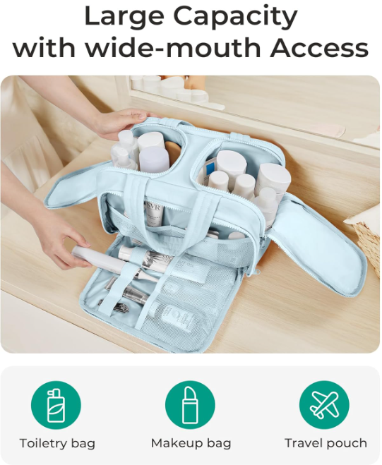 - Easy Access and Keep Upright : Full opening and not piling up for easy access to items. Double side full open design of travel bag for toiletries keeps cosmetic bottles and toiletries can stand upright in the middle compartment. Avoid leakage during transit